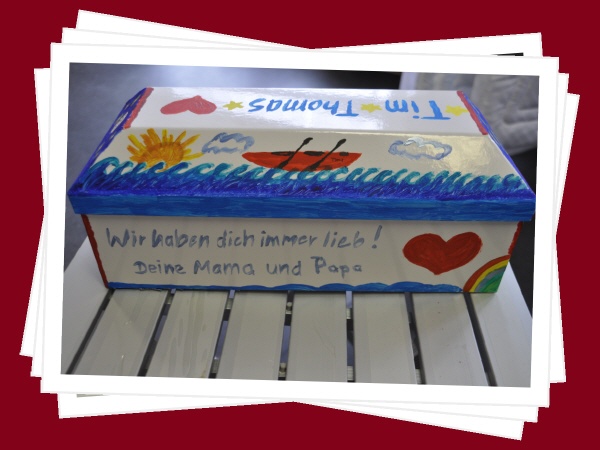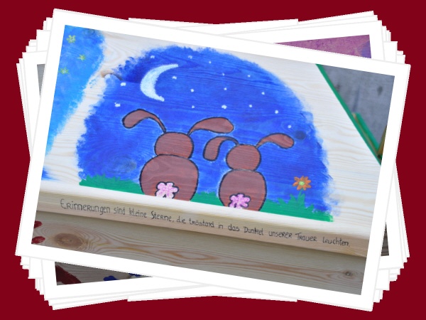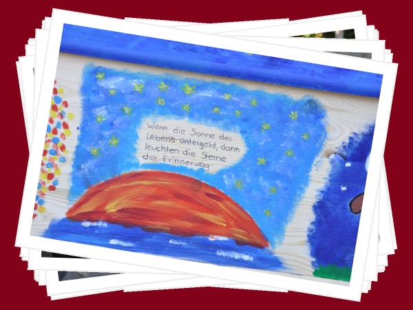Studien zeigen, dass Gefühle in Farbe ausgedrückt, wahre Wunder wirken und unendlich heilsam für den Betroffenen sind. Hierbei ist es völlig egal, ob Sie malen können oder nicht, denn die Erfahrung zeigt, dass sobald man sich mit dem Thema beschäftigt, wahre Kunstwerke entstehen, auch ohne Können. Schön ist es immer wieder zu beobachten, wie Familien gemeinsam "Ihr Projekt" angehen. Erst zaghaft und nicht wissend was eigentlich zu tun ist um dann im Tun festzustellen, dass man das Wissen um den Verstorbenen wunderbar in verschiedene Muster, Motive und Bilder ausdrücken kann.